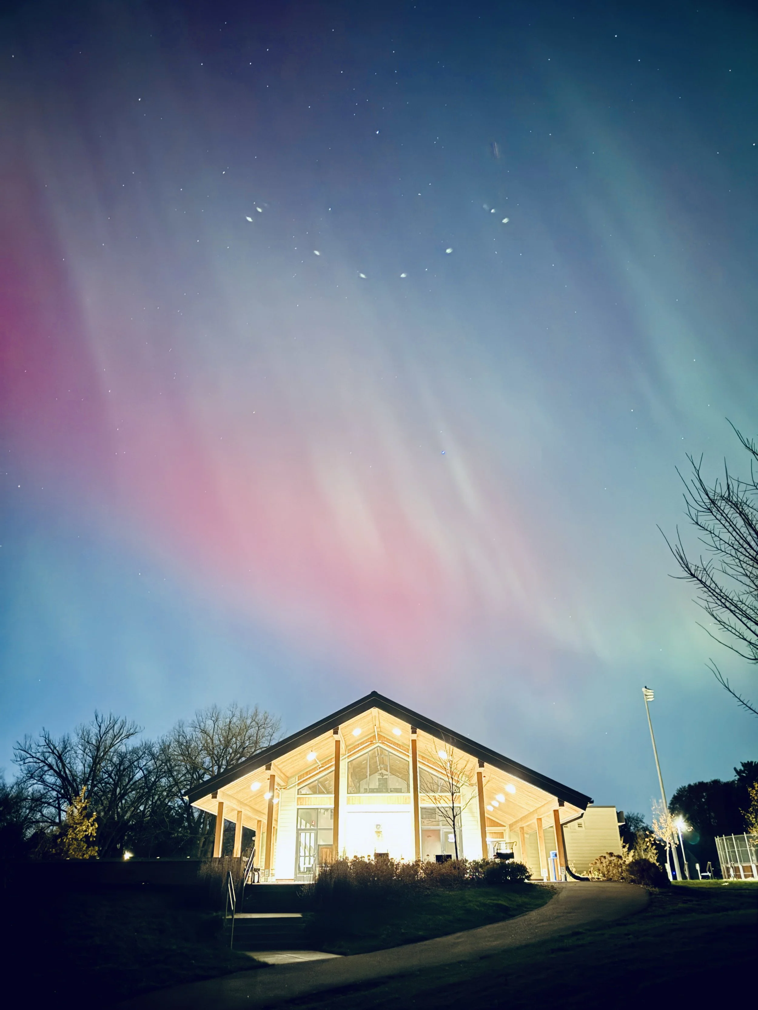 On Tuesday evening, it seemed like all of Minnesota experienced a rare display of the northern lights, casting vibrant pink and green hues over the Wakefield Community Building in Maplewood. The illuminated sky created a striking backdrop for the pavilion-inspired structure, highlighting its warm interior glow, expressive roofline, and connection to the surrounding park.